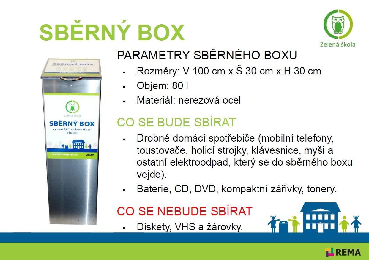 Vysloužilé elektrospotřebiče z domácností a baterie mohou návštěvníci školy jednoduše odkládat do sběrného boxu, který je umístěn v hale školy. Projekt naší škole také umožňuje bezplatnou ekologickou likvidaci velkého elektroodpadu.