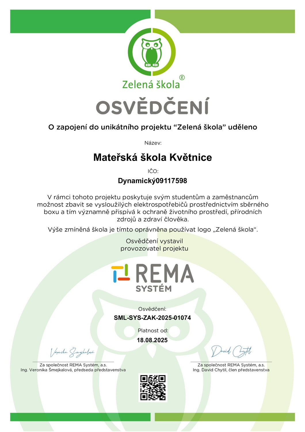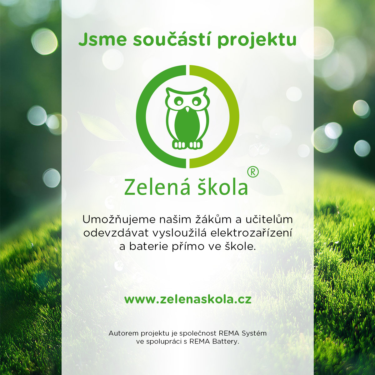 Naše škola se zapojila do projektu Zelená škola a umožňuje tak žákům a učitelům třídit nejen základní složky odpadu jako je papír, plast a sklo, ale i elektroodpad a baterie.